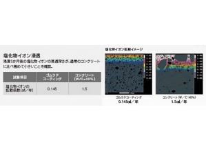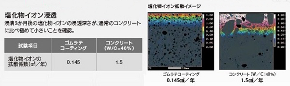 ・耐塩分浸透性に優れた成分の混和により、外部からの劣化因子(塩化物、水分)に抵抗し、劣化を抑制する。
