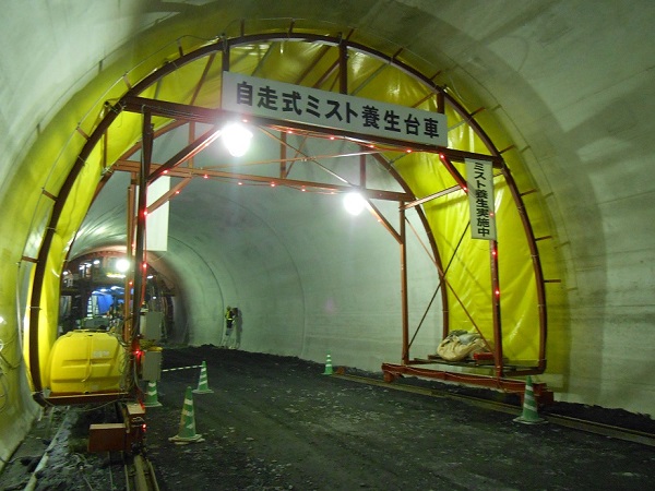 ・噴霧作業中は、覆工コンクリート表面の相対湿度を95%RH以上確保でき、28日圧縮強度が標準養生と同等の強度発現が期待できる。