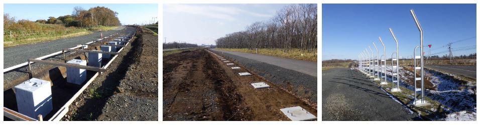 ・型枠が不要のため、掘削面積と埋戻しが軽減されるとともに、アスファルト道路付近の基礎設置が可能となる。