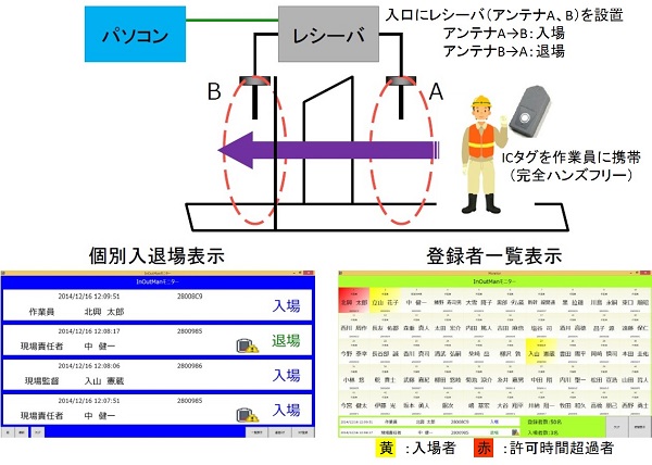 ・ICタグ毎に滞在許可時間を設定でき、許容時間を超えた場合はアラートを出せるため、労働時間超過管理が容易となる。