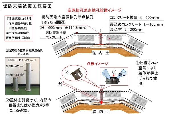 ・堤防天端被覆コンクリ-ト厚さが300~600mm(標準範囲)。