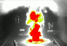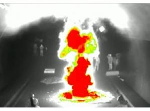 従来は煙の向こう側の火災検知は難しかったが、熱画像処理により煙に遮れらた側の火災や人も検知できる