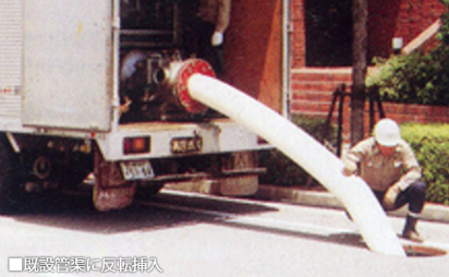 熱硬化性樹脂を含浸させた強靱なシールホースを、既設マンホールから既設管内に反転加圧挿入し、管きょ内で加熱硬化させることで、管の内面に密着させ新しいパイプを形成する工法である。