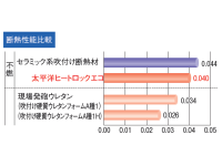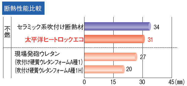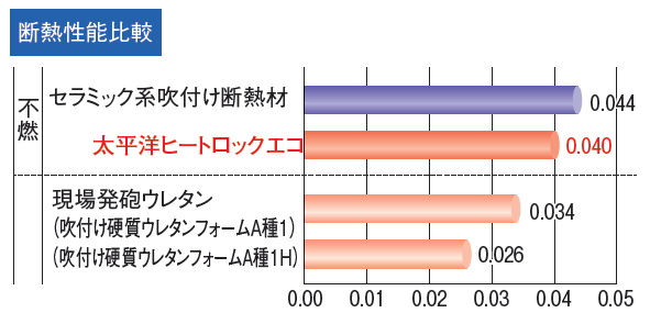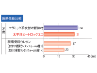 ①完全無機質の不燃断熱材 完全無機質材料のため,施工中材料に引火して火災を引き起こす心配がない。また,供用後における火災時にも断熱材に起因する延焼拡大の心配がなく,有毒ガスの発生がない。②環境配慮型製品 地球温暖化の原因となるフロンガスの発生がなく,また,CO2排出量削減に貢献する低炭素型建材製品(非セメント系)である。なお,主な使用材料であるロックウールは,鉄鋼生産の副産物である高炉スラグを主原料とした環境にやさしい材料である。③高断熱性 セメント,繊維系では実現しえなかった低密度(0.18g/㎤),高断熱(0.040W/(m・K))の断熱工法である。④優れた施工性 吹付け施工のため,あらゆる形状にも対応可能である。また,厚吹き施工性にも優れた工法である。