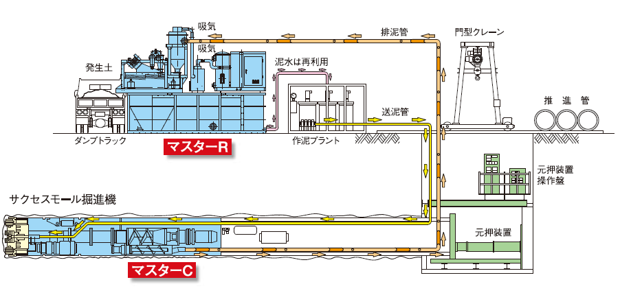 切羽に圧送された地下水圧以上の圧力(地下水圧+0.02MPa)をもつ高濃度泥水は、地山側に浸透流を生じつつ、この浸透流により高濃度泥水が地山に目詰作用を発生させ、掘削面すべての方向の土粒子に完全密着するマッドフィルムが形成される。このマッドフィルムが、泥水圧を受け地下水を封ずるとともに、土粒子を固定し、ゆるみ土圧を発生させない。地山側は常に受圧状態におかれ、掘削面すべての面で高安定が得られる。