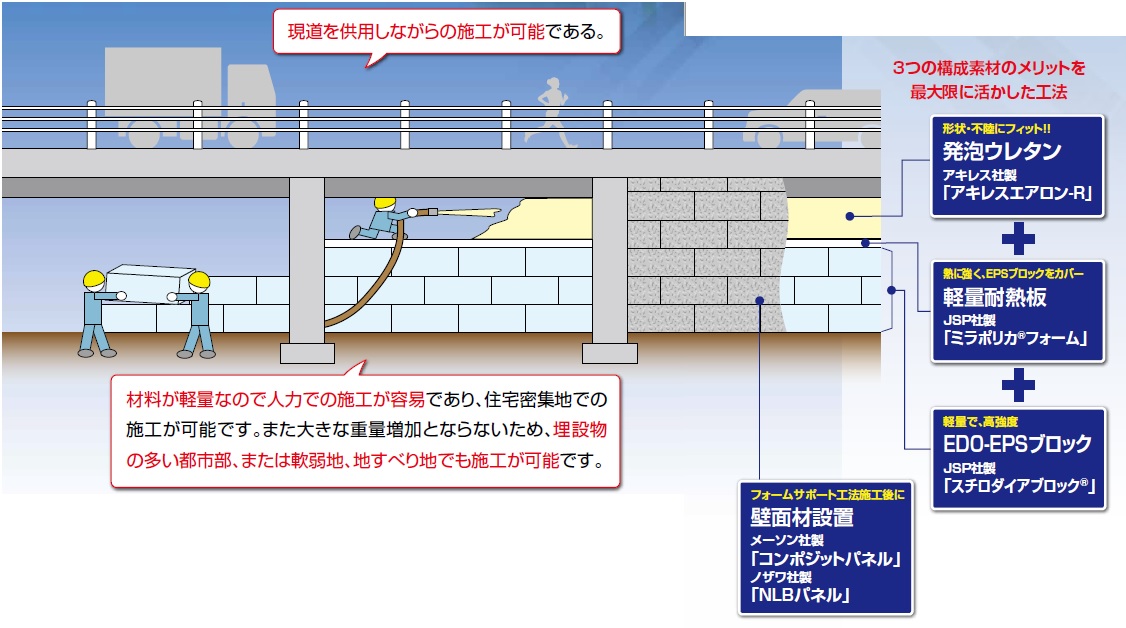気泡混合軽量盛土工法から、EDO-EPSブロックと発泡ウレタン等を併用して補強する中詰め工法に変えた