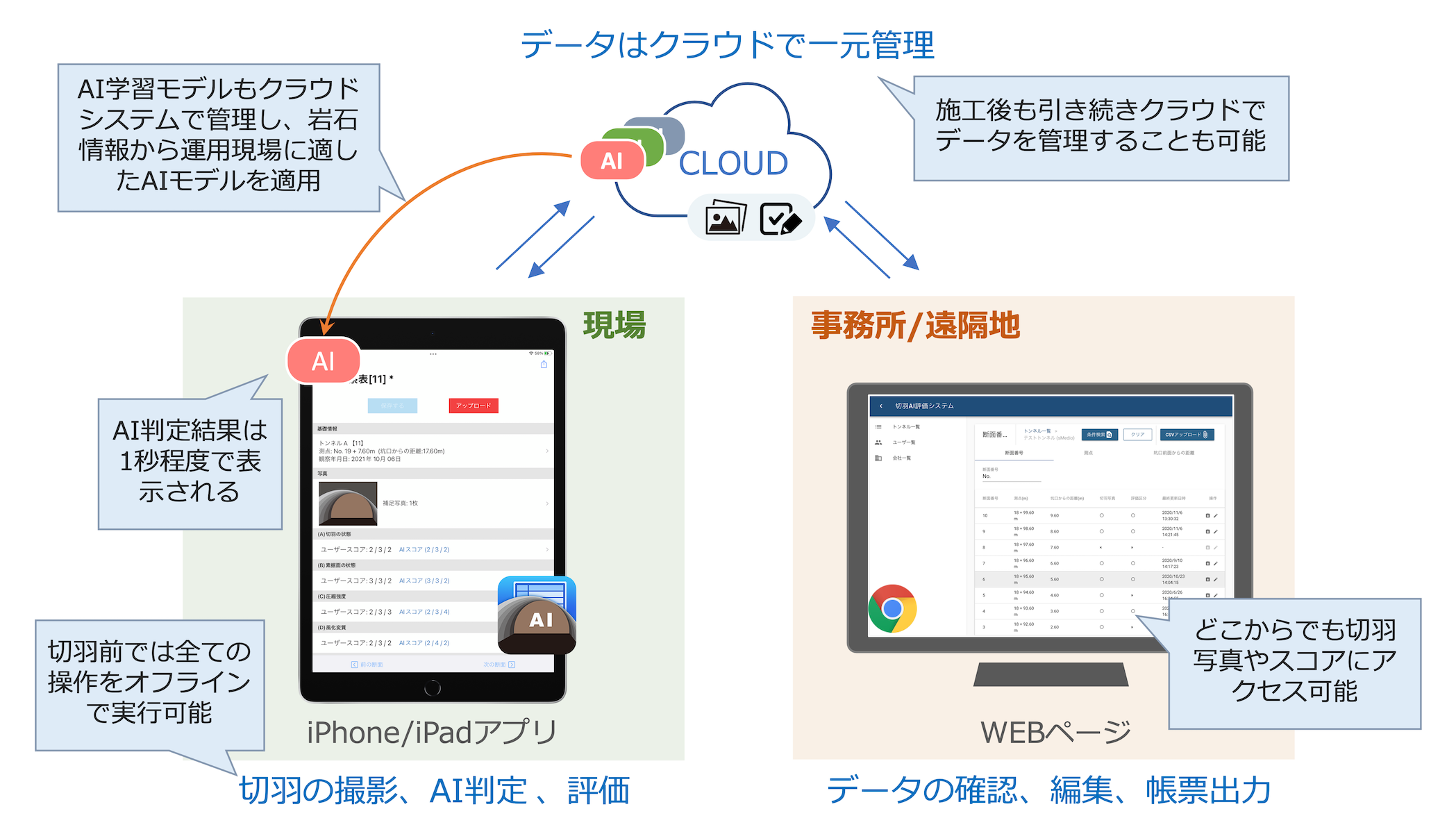 ・切羽評価結果を紙やPCでの管理から、iPhone/iPad及びWebアプリを用いたクラウドシステムでの管理に変えた。