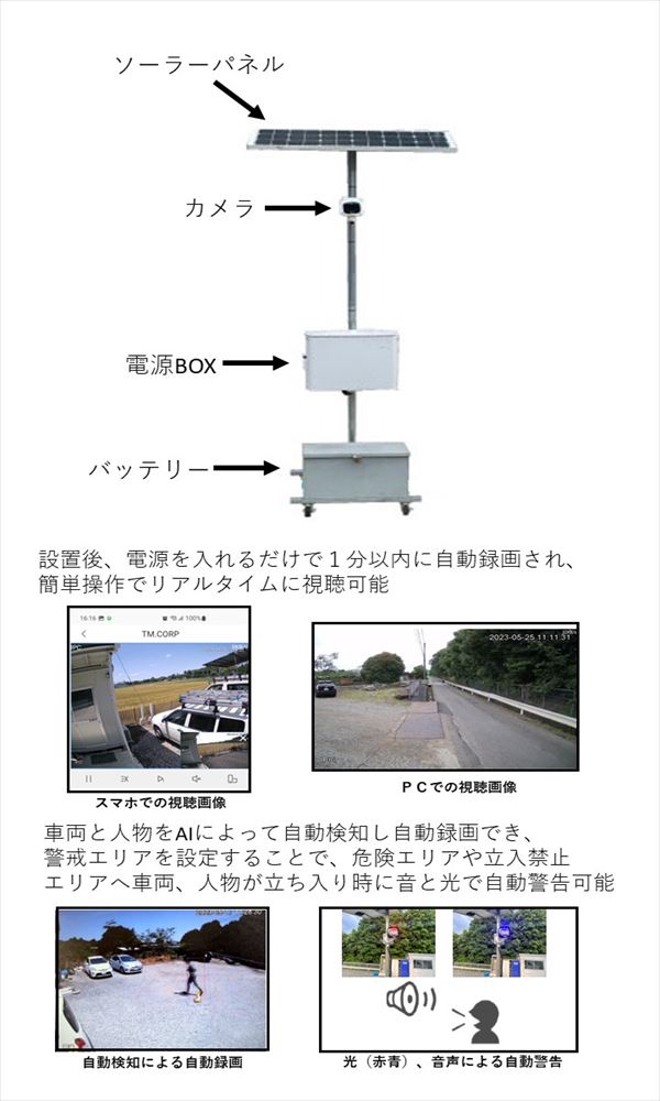 ・警戒エリアを設定することができ、危険エリアや立入禁止エリアへ車両、人物が立ち入り時に音と光で自動警告できる。