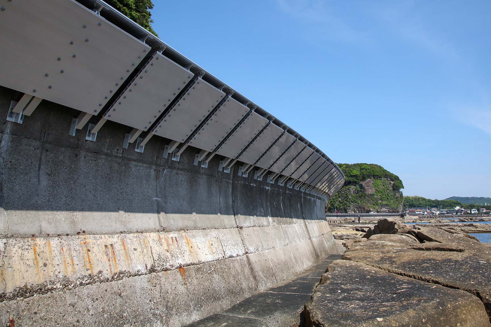 既設護岸の越波対策に使用するアルミ合金製波返し製品。コンクリート工事が不要となるため、工期の短縮が図れ、眺望を維持したまま対策が可能。