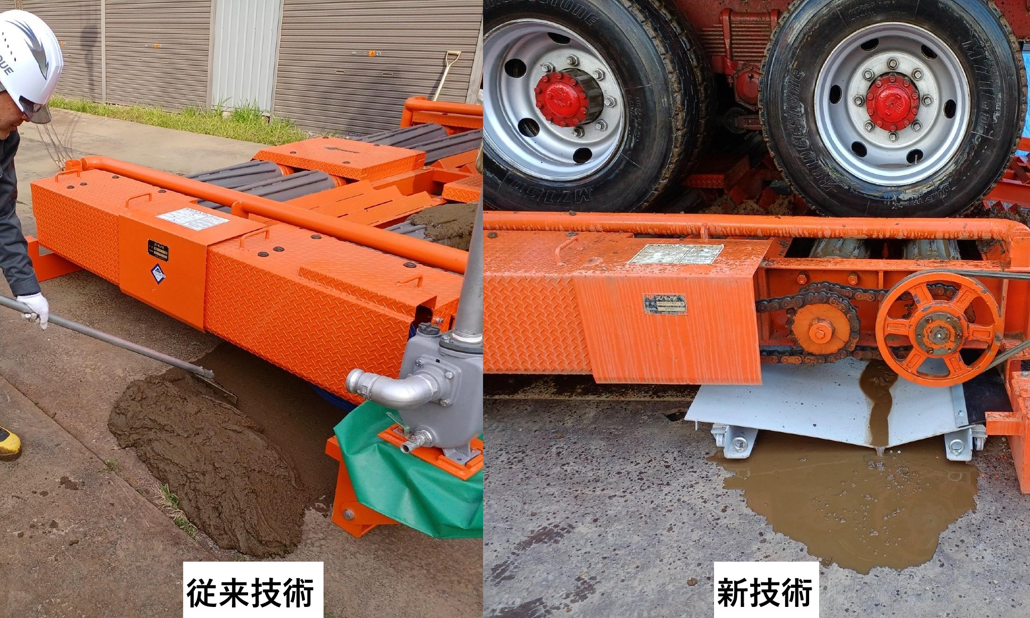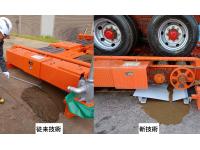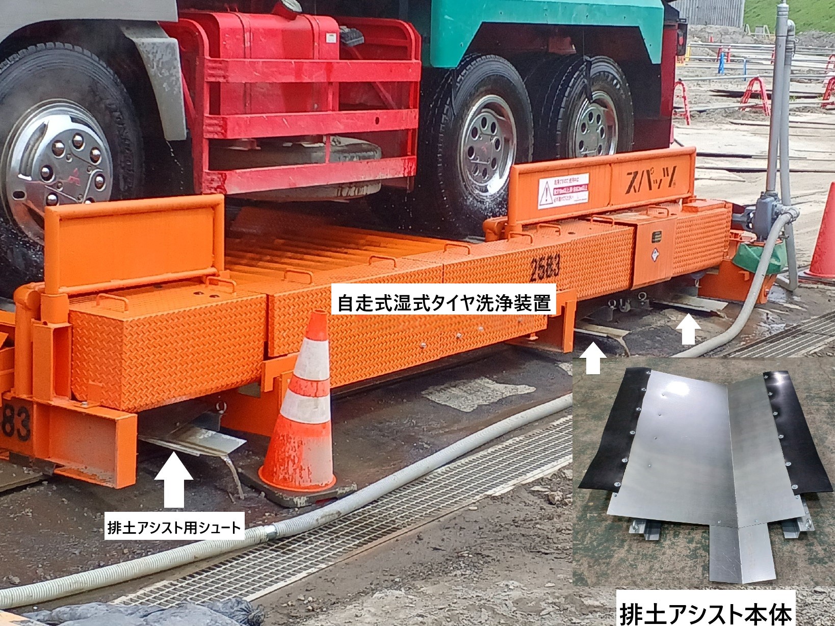 従来の湿式スパッツの排土方法を「人力による排土」からタイヤ洗浄に使用した水を利用し、電気を使用しない「鋼製の板を用いた排土」に代えた。