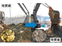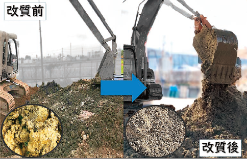 浚渫工事等から発生する高含水土砂や付着性が著しい土砂を改良する際に使用する材料を生石灰から中性の固化処理剤(高分子重合体・ケイ酸塩鉱物・炭酸塩)混合物に替えた