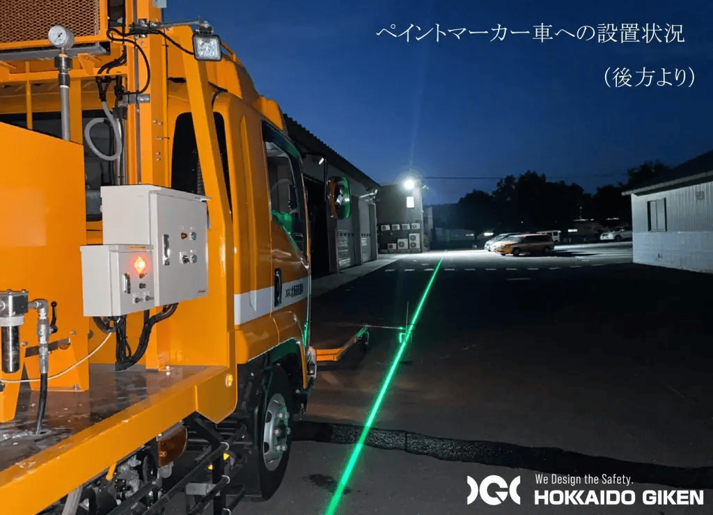 従来の白墨による罫書線を光源による投影パターンに変えることで、瞬時に区画線の所定位置を可視化することが可能となった。