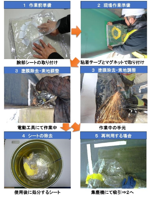 ・施工面を直接養生した空間内で塗膜除去作業を行うことにより、保護具の着用が不要になり、経済性の向上、周辺環境への影響の向上(二次産業廃棄物量の縮減)が図れる。