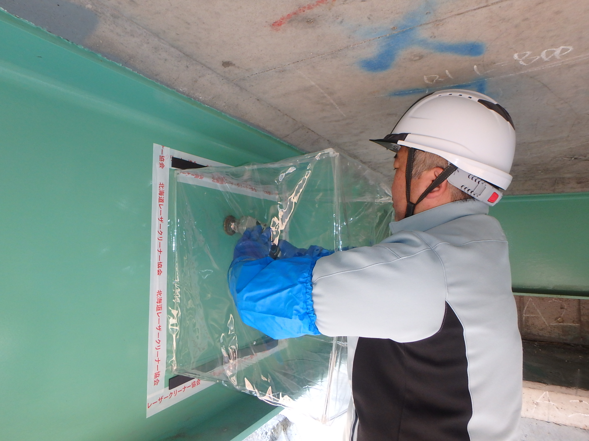 従来は、周囲をパネルで囲い内部をシート養生し、クリーンルームを設置、保護具を着用して行っていた塗膜除去作業を、施工面を直接養生し、養生された空間内で塗膜除去作業を行うように変えた。