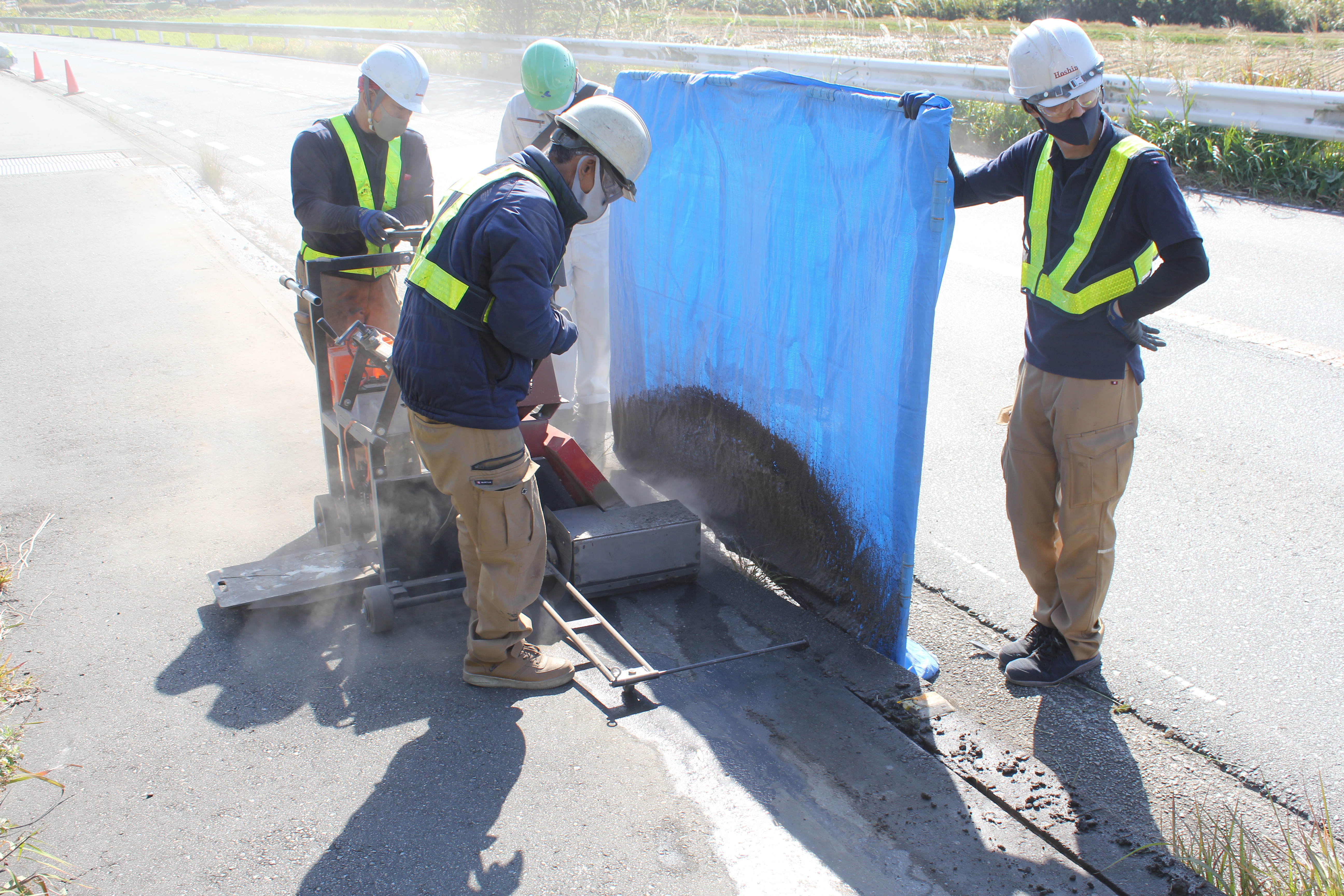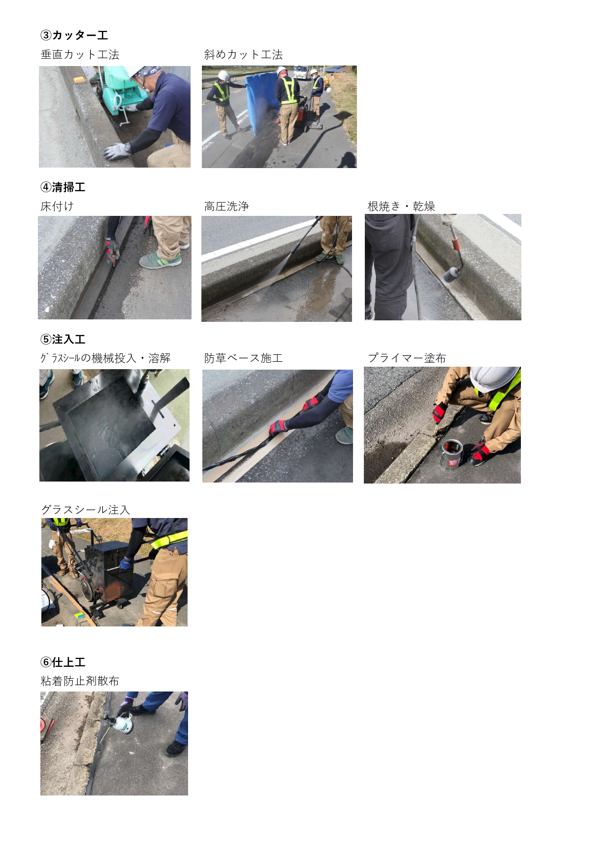 施工方法は既に普及しているカッター工やクラック注入工を組み合わせて、既存施工業者が施工可能な作業工程とし、工法の拡がりに応じて施工体制を組み易いものとした。