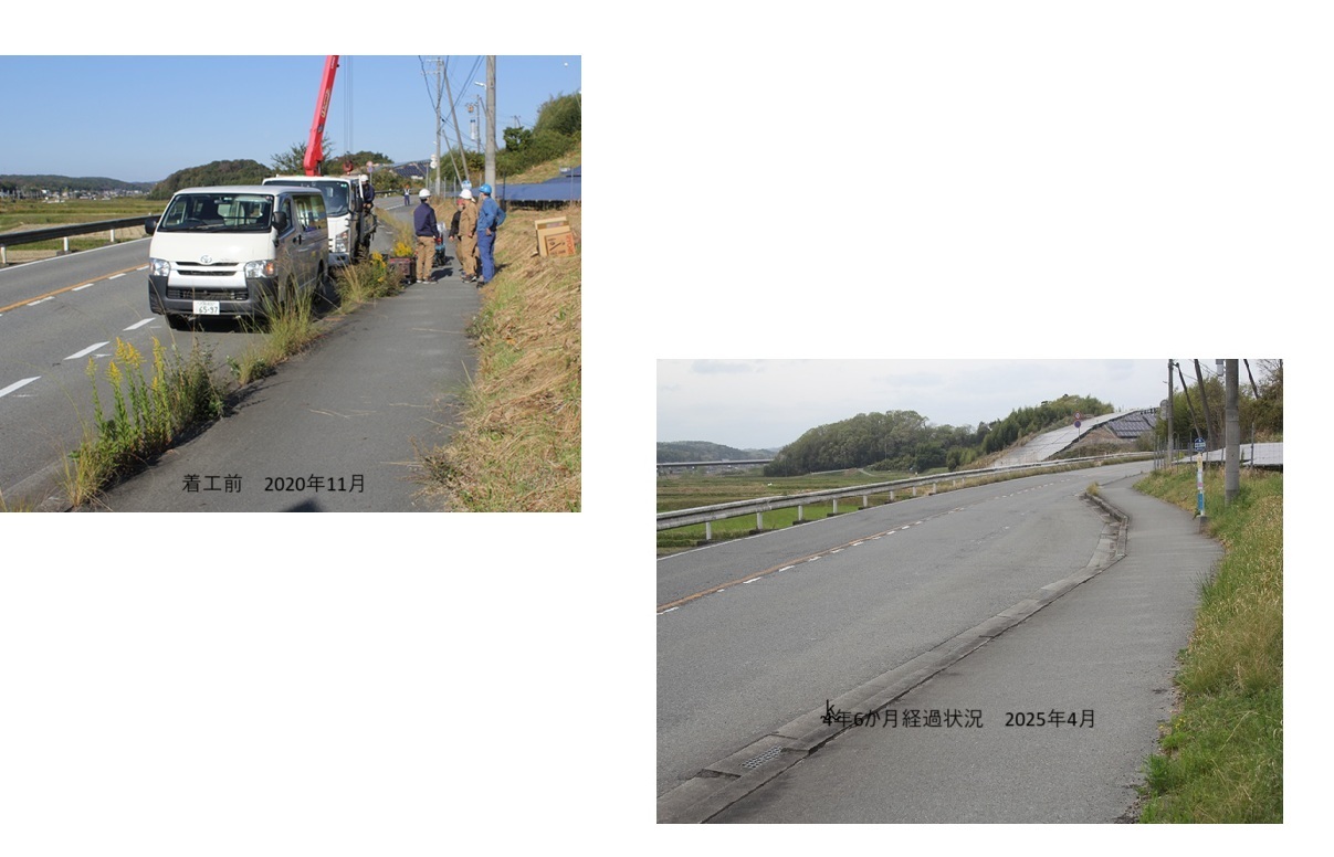 雑草が繁茂した道路構造物と舗装の隙間などに対し、除草工による雑草の撤去から、除草工+防水目地材(グラスシール)注入に変えることで防草効果を得ることができ、年に複数回実施する除草工を削減することが可能になる。