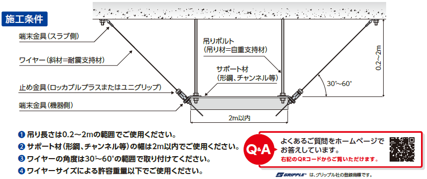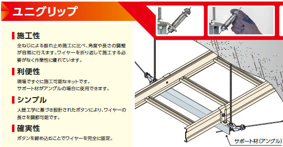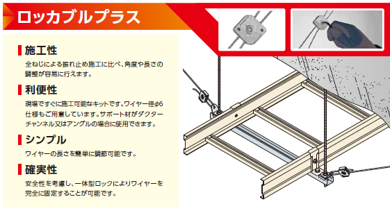 現場ですぐに施工可能なキット。ワイヤー径φ6mm仕様もある。サポート材がダクターチャンネル又はアングル等の形鋼の場合に使用できる。