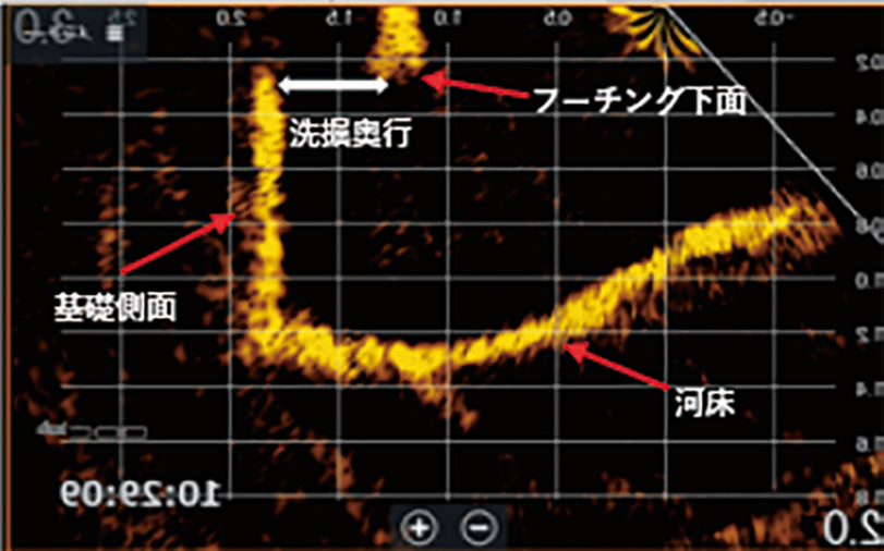 ④ソナーの反射波を図面上に重ね合わせ、人力でCAD等を用いて洗掘ラインを可視化する。 -