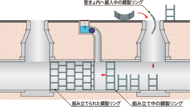 分割された鋼製リングをマンホールから運び入れ、ボルト結合により鋼製リングを組み立てる。