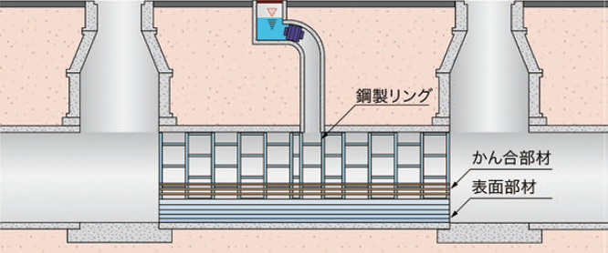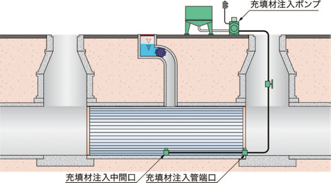 既設管きょと表面部材との間に高流動・高強度な充填剤を注入する。