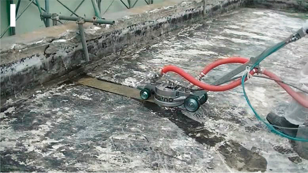 ③吸引装置を取り付け、除去した接着剤・塗床材・洗浄水を除去と同時に吸引・回収しながら行うため、後工程の省力化が可能。