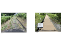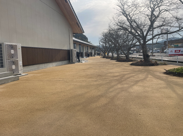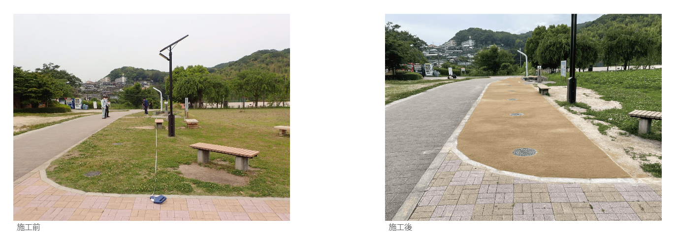 従来のアスファルト合材による舗装から、基盤材に砕石・砕砂製造時に発生する石粉、固化材に海水由来の材料製造における副産物である高強度マグネシア固化材を使用した材料(ZEROカーボNソイル)による土系舗装とした。