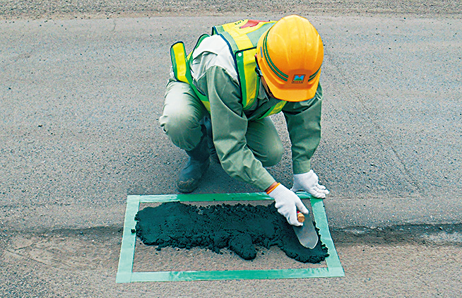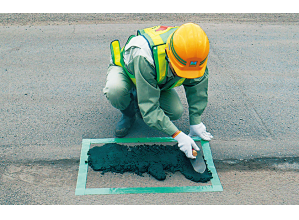 速硬型ポリマーセメント系の段差修正材。耐久性が高く、既設舗装と接着性が良好な材料。道路の路面補修材として、荒れた路面のリフレッシュなどにも最適。