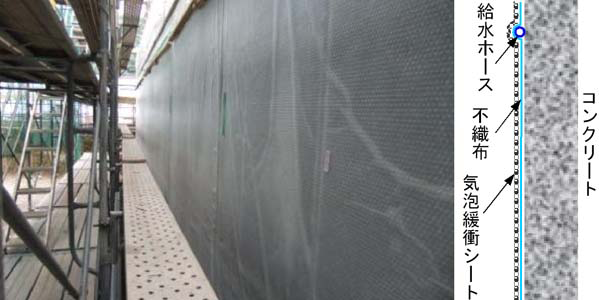 ・保水性のある不織布と凹凸のある気泡緩衝シートを重ねた給水養生シートをコンクリート面に設置する。
