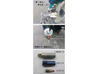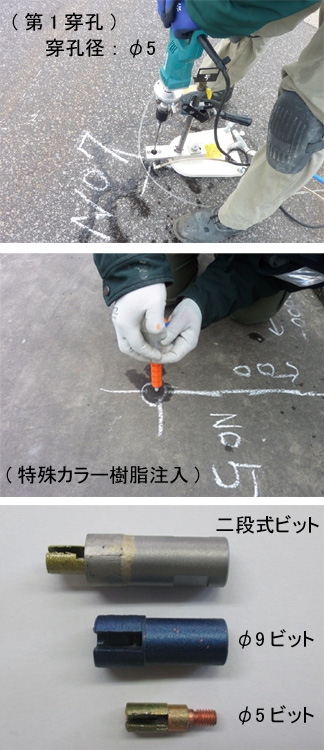 ・従来技術では穿孔時にコンクリート内部のひび割れに角欠けを起こしていたが1度目の穿孔後、樹脂を注入硬化させることで同一箇所に2度目の穿孔をした時に角欠けを起こすことなく正確なひび割れ幅の計測が可能になった。