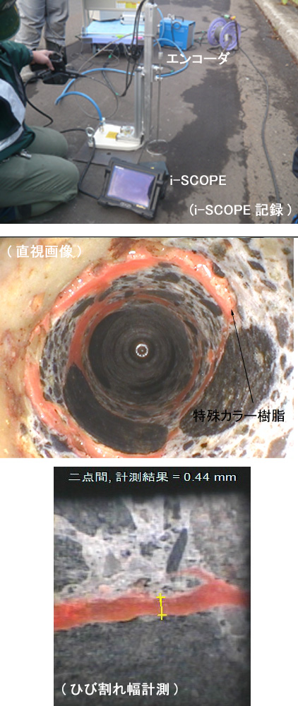 ・従来技術では採取したコアを持ち帰り、真空チャンバーで蛍光エポキシ樹脂を含浸させていたがSingle i工法は現場でリアルタイムに検査できる。
