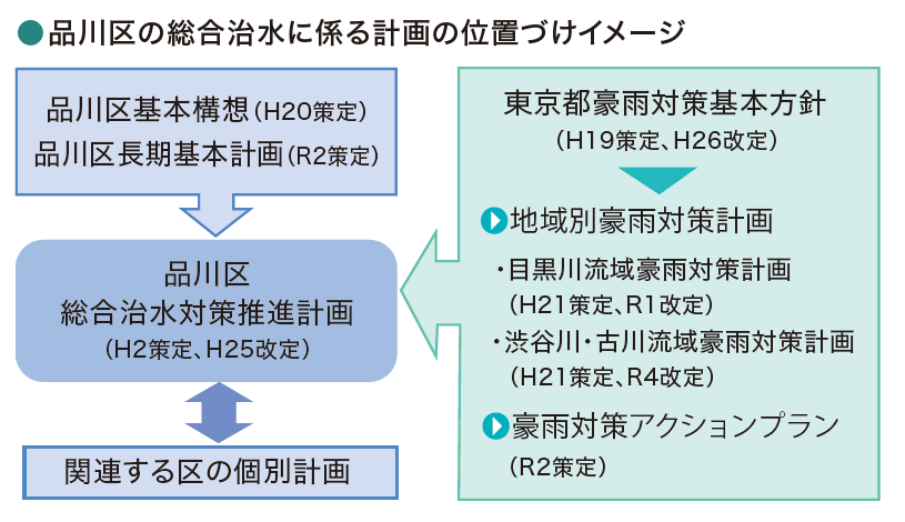 品川区では昭和63年度策定の「品川区総合治水基本計画」をもとに、平成2年度に「品川区総合治水対策推進計画」を策定した。しかし平成17年9月に、時間100mmを超える豪雨で都内の約6,000棟に浸水被害が発生したことを受け、東京都が総合的な豪雨対策の計画「東京都豪雨対策基本方針」や、同基本方針に基づき選定された対策を促進する河川流域について具体的な対策内容や実施のスケジュールを定める「流域別豪雨対策計画」を策定。品川区もこれを踏まえて、平成25年度に「品川区総合治水対策推進計画」を改定し、区内の治水対策を推進してきた。