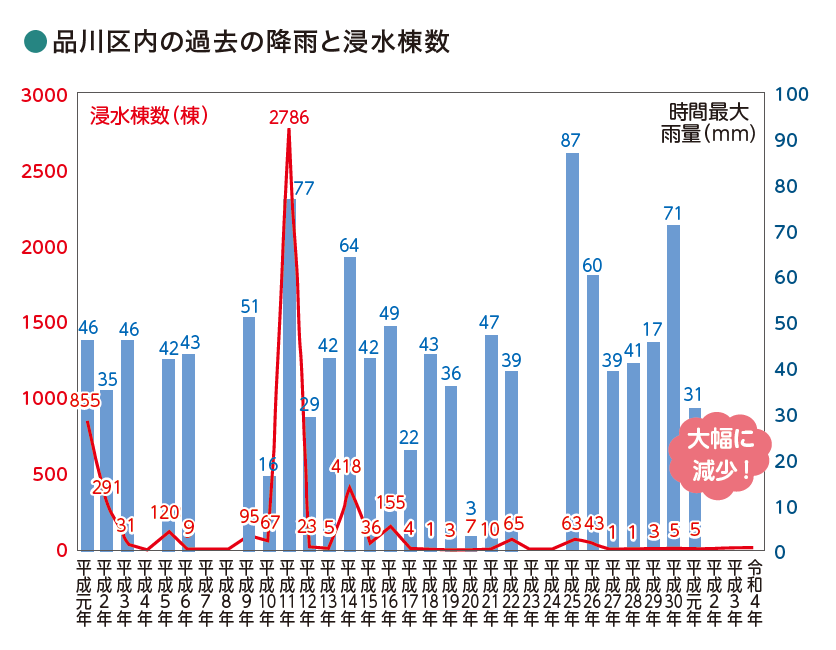 品川区内においても、平成10年までは五反田駅周辺を中心とした目黒川沿いに浸水被害が集中し、そのほかにも平成11年8月に発生した集中豪雨(時間最大77mm)では、戸越銀座周辺や三ツ木通り、立会川周辺を中心に約2,800棟の浸水被害が発生している。
