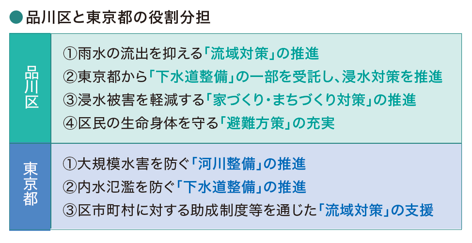 東京都豪雨対策基本方針(平成26年改定)では、「流域対策」、「河川・下水道整備」、「家づくり・まちづくり対策」、「避難方策」の4つを柱として、総合的に治水対策を推進することになっている。品川区の対策もこの4つを基本としているが、治水対策を効果的かつ効率的に進めるために、品川区と東京都で役割分担を明確にし、特に下水道整備の一部を受託しているところに大きな特徴がある。