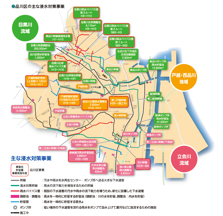 これまで浸水被害が多く発生していた目黒川沿い、立会川周辺、戸越・西品川地区の浸水対策事業など14事業を受託、現在も1事業が施工中である。雨水バイパス管や調整池などの大規模な施設も品川区で積極的に整備することで、浸水被害軽減を図ってきた。