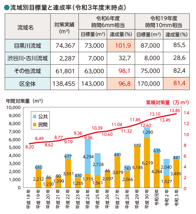 この結果、品川区全体では令和3年度末時点で令和6年度目標に対して達成率が96.8%と概ね目標を達成。対策強化流域に指定されている目黒川流域は、すでに目標を上回っている。なお、同じく対策強化流域の渋谷川・古川流域は目標値を下回っているが、これは流域内の土地利用状況から、新たに流域対策を実施できる箇所が少ないことが原因となっている。
