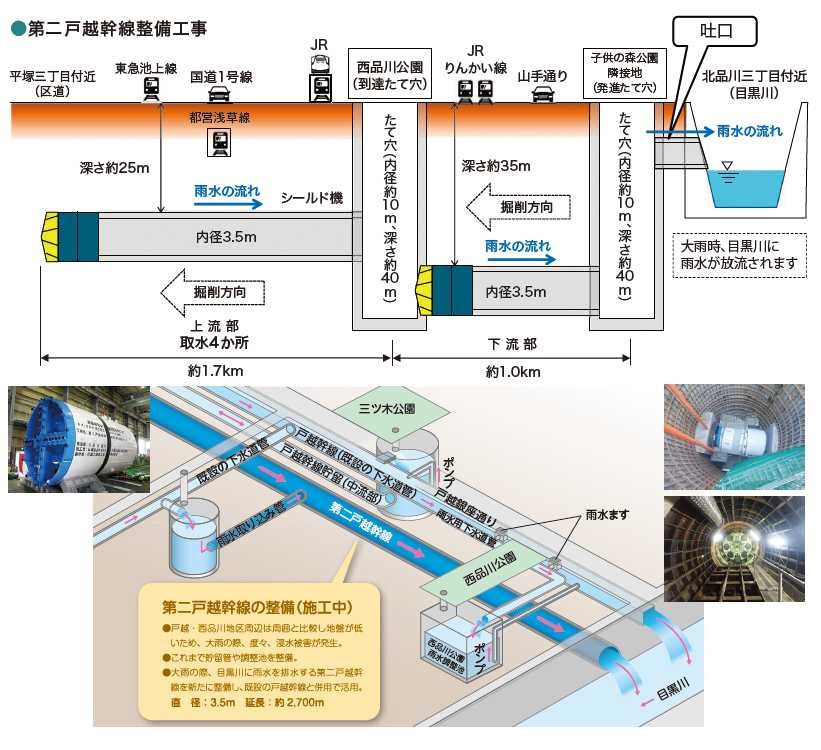 東京都豪雨対策基本方針(平成26年改定)により、「50mm拡充対策地区」に位置付けられている戸越、西品川地区周辺の浸水被害を軽減する事業である。新たに目黒川に雨水を排水する直径3.5mの下水道管を2.7km整備し、既設の戸越幹線と併用することで時間50mmの降雨に対応可能となる。また、これまでに整備した既存の貯留管や調整池の活用により、時間50mmを超える降雨に対しても浸水被害軽減の効果が期待されている。