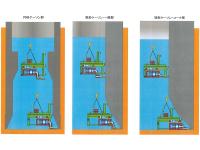・専用のアタッチメントを使用し、全周回転掘削機を撤去せずともダウンザホールハンマをセットすることができる技術。 ・ダウンザホールハンマ施工により岩盤を破砕し、先端地盤の応力を開放することで掘削...
