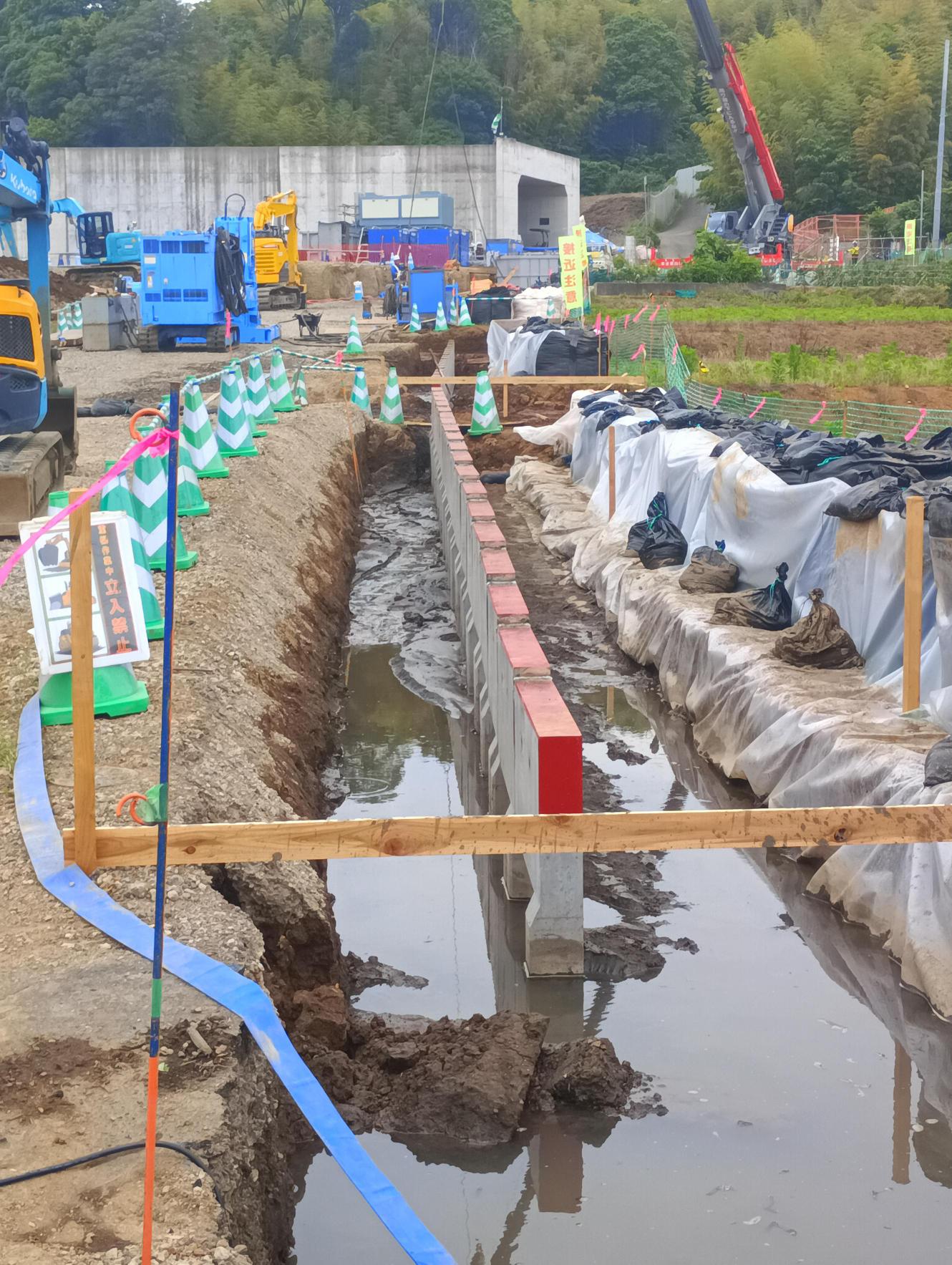 H形鋼とコンクリート矢板の複合構造により土留壁を構築する工法。