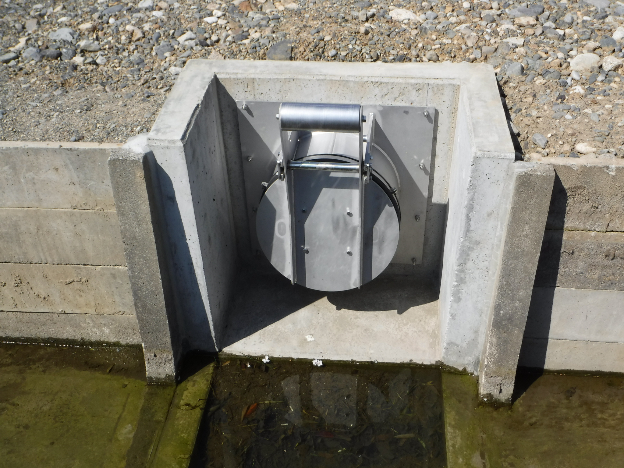 水路底部がフラットな既設の引上げ式樋門ゲート設備において、水路底版に敷段差を設けず、ゲート設備の無動力自動化改修を行う。