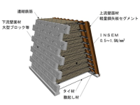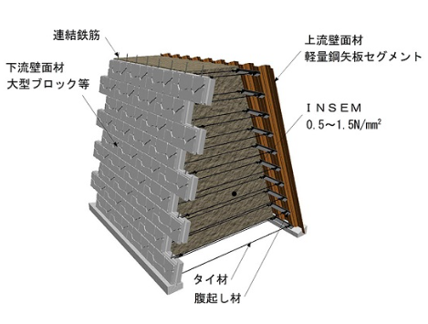 低強度ソイルセメントとダブルウォール構造による複合構造形式の砂防堰堤。 INSEM-ダブルウォール(DW)堰堤は、数多く設置されてきたダブルウォール(DW)堰堤の中詰材を土砂からINSEMに代え格段の強靭性をもたせた堰堤構造である。 中詰材を外側から壁面材とタイ材で拘束することによる物理的補強(外部拘束補強)とセメントで固化する化学的補強の協働効果により、中詰材に低強度レベル (0.5~1.5N/mm2)のソイルセメント(INSEM)を用いることが可能。