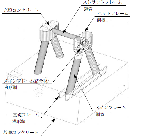 Δ型(デルタ型)スリットダムは、メインフレーム部材として2本の鋼管を使用し、これをΔ型に組立てた透過型スリットで、鋼管同士の接合に鉄とコンクリートとの複合構造を採用している。
