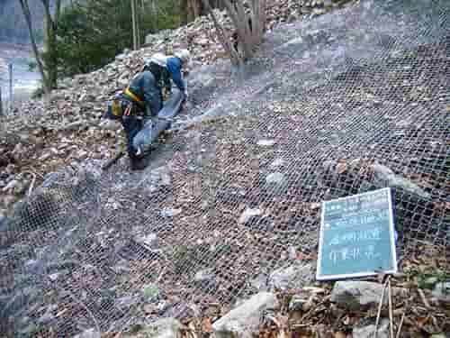 SK厚ネットは、浮石や転石の初期移動を抑える落石予防工で、厚ネットを張ることで、土砂や郷土の種...