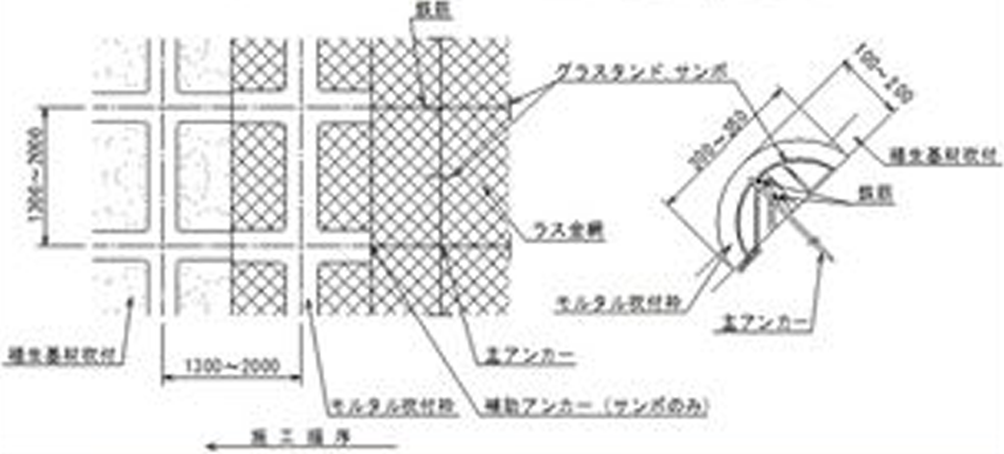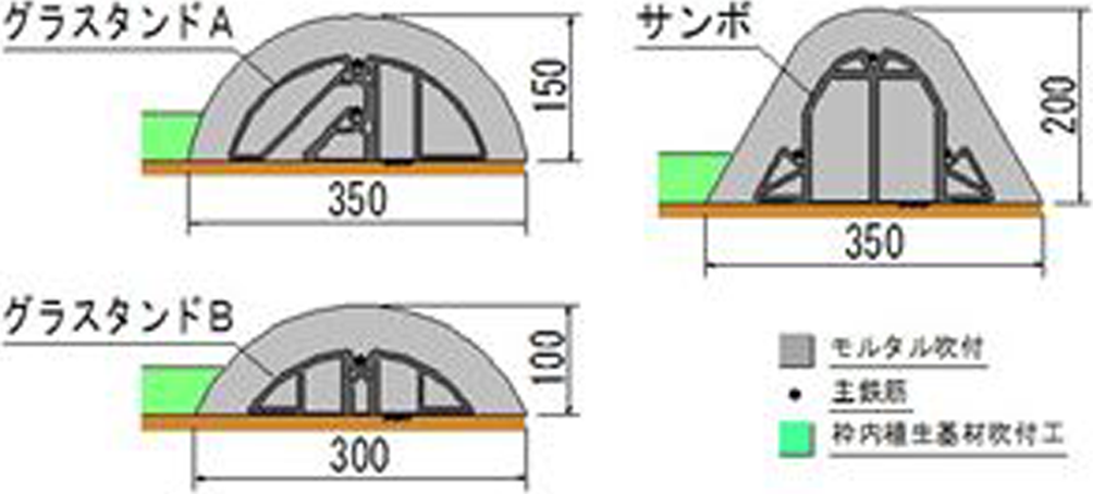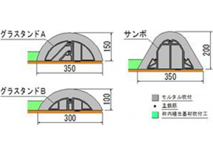 鉄筋及びグラスタンドにモルタルを吹き付けて欠円状の枠を形成し枠内に植生基材を吹付て緑化する