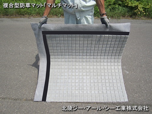 ガラス繊維強化セメント製の小平板と防草シートによる複合型防草マット。