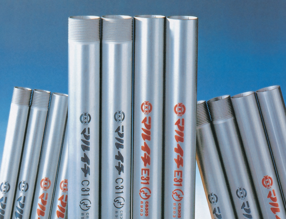 私たちの日常生活には欠かすことのできない電力や電気信号を伝える電線やケーブルを保護する鋼管で非常に安全性の高い製品として利用されている。 弊社の厚鋼電線管は内外面に溶融亜鉛めっきを施しており、非常に耐食性が高い製品となり G16~G54サイズはストレッチ・レデューサーによる熱間仕上げが行われ、曲げ加工性にも優れている。 衝撃や圧縮に強く、電磁遮蔽効果もあり屋内外、露出配管、埋込配管問わず 全国の発電所や清掃工場、情報BOX、共同溝、データセンター等の電気工事に多く採用されている。