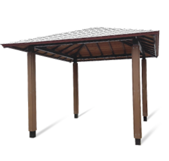 3寸勾配屋根の落ち着いた佇まい。アルミ屋根や合成木材柱など、耐久性を高めた四阿。