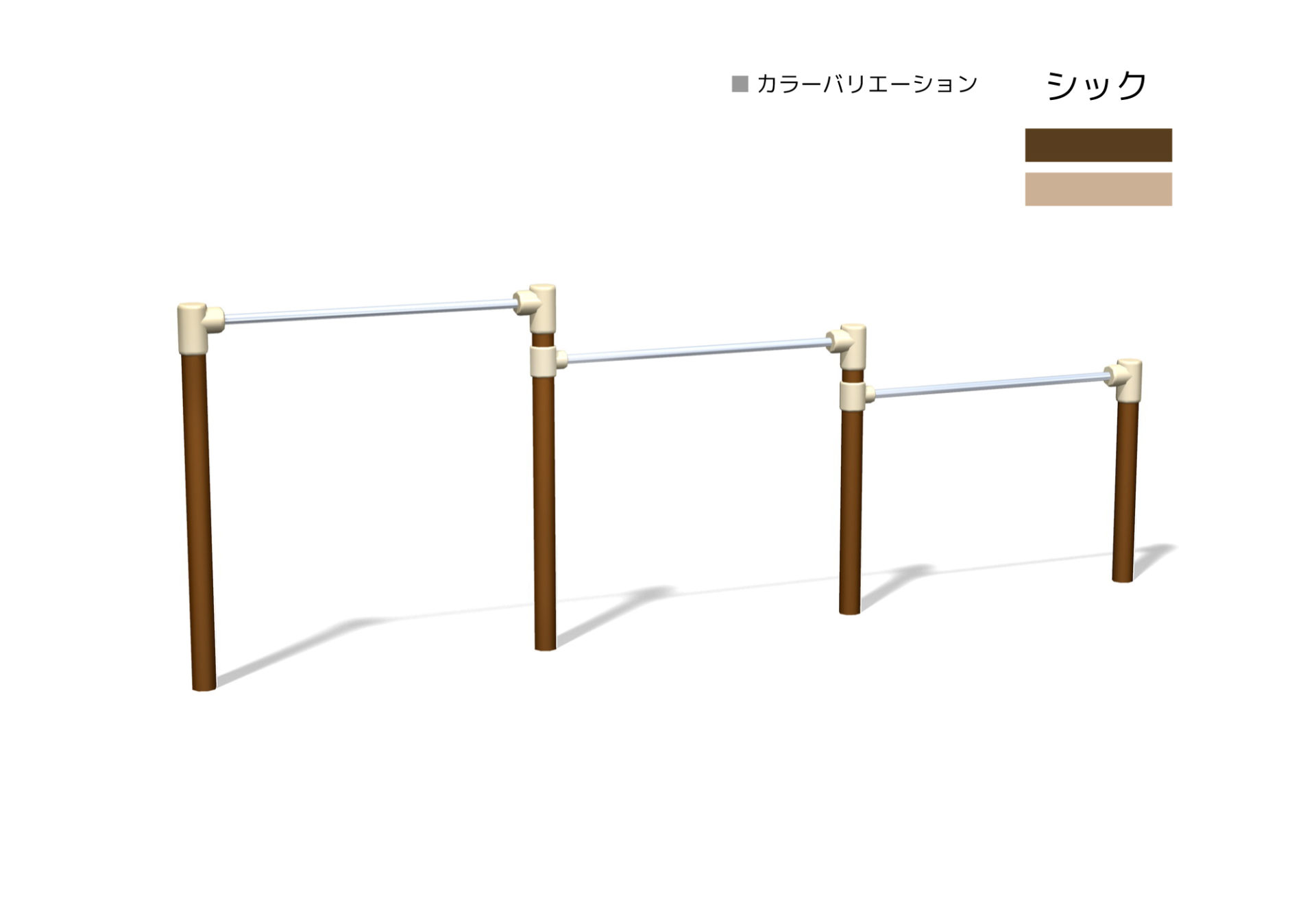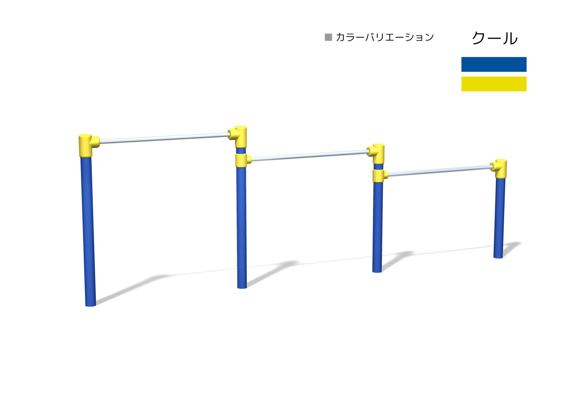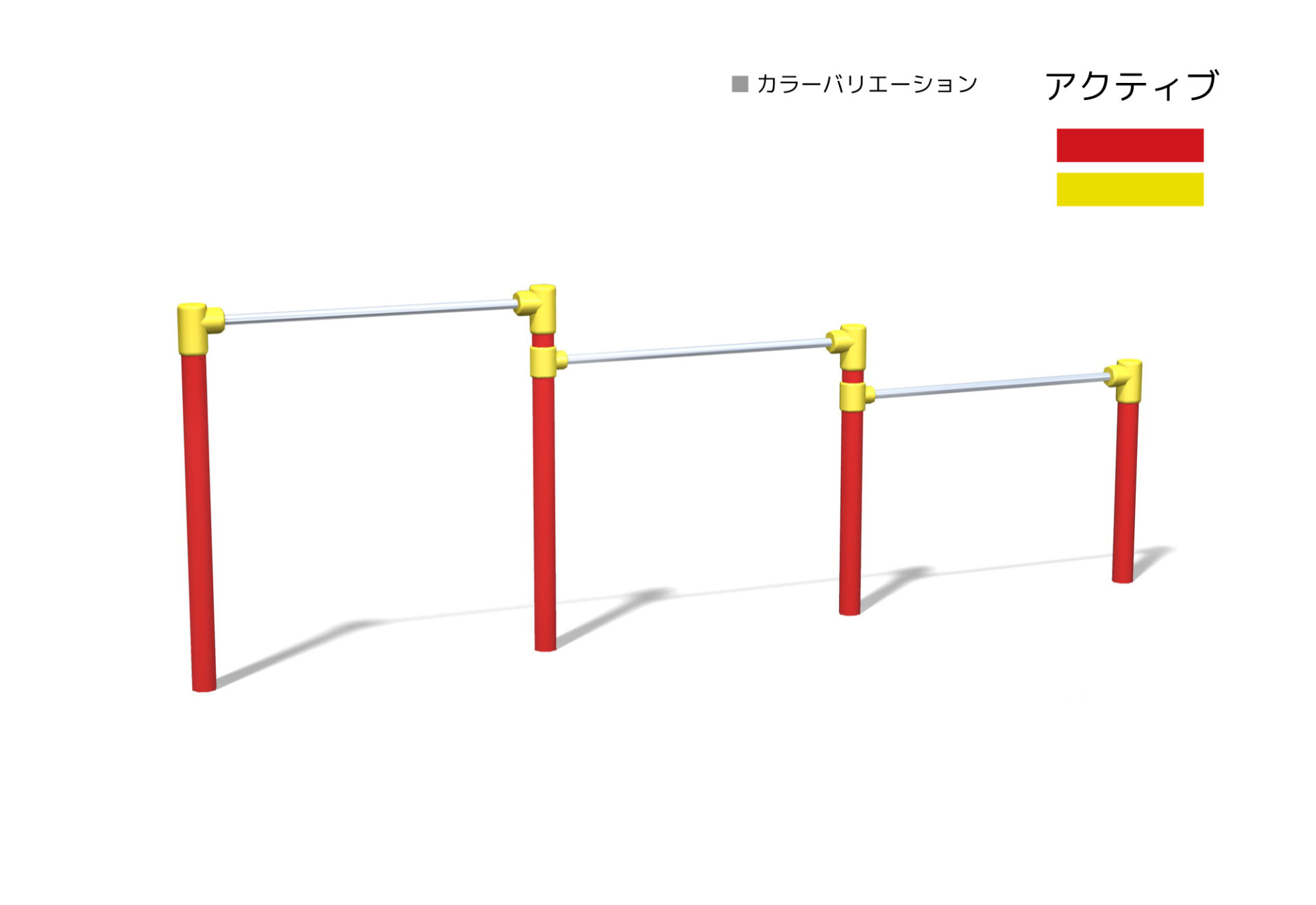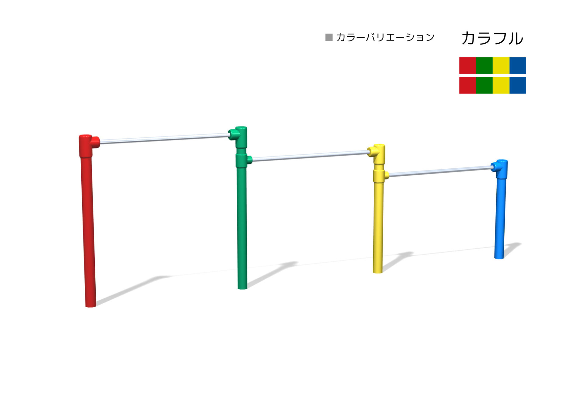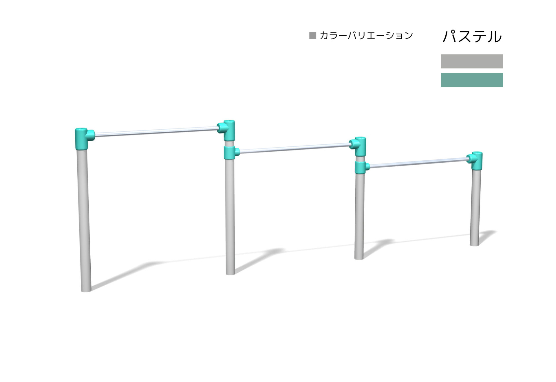 低鉄棒(3連) 対象年齢3~12歳 OT1-TE-4020[W=1.5m] 安全領域:7.57×3.63m 製品寸法:4.57×0.08m OT1-TE-4400[W=1.7m] 安全領域:8.47×3.63m 製品寸法:5.47×0.08m
