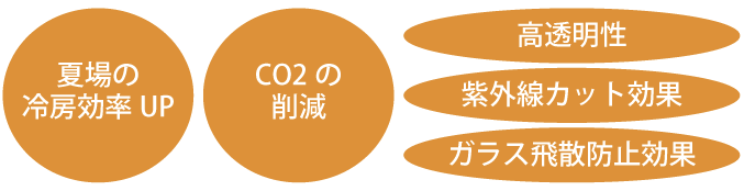 地震などの災害や物体がガラスに衝突した場合のガラス飛散を低減し、二次災害の対策にも有効。 人体に有害な紫外線をカットし、家具などの日焼け防止に役立つ。紫外線は室内の蛍光灯などからも放射されるので褪色現象は発生するが、無処理に比べ大幅に褪色を押さえる効果がある。 室内外の光の照度により明るいほうから暗いほうの透視性を抑制するメタルタイプ。