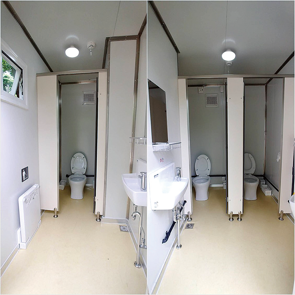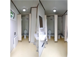 ユニバーサル個室付男女兼用簡易水洗トイレユニット(床下便層4,600L内蔵)。...