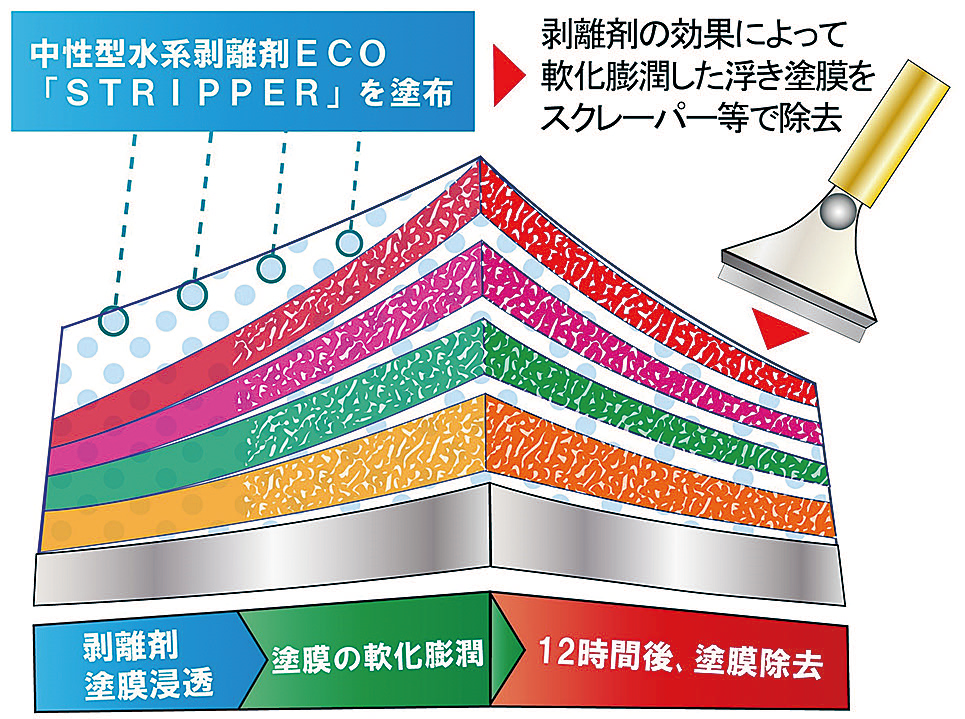 ・ 塗布後の初期塗膜軟化反応を抑え、塗膜内部へ深く浸透させる事により、多くの塗膜を除去させる事が可能。